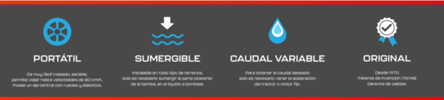 Todas con el mismo principio de uso, son tracto bombas (para usar con tractor) pero se pueden adaptar a diferentes plantas motrices, por ejemplo motores eléctricos, directos o con correas, motores a explosión, a través de cardanes o de cajas reductoras.